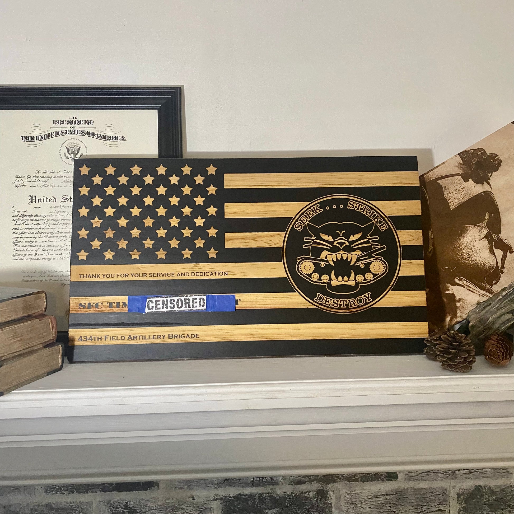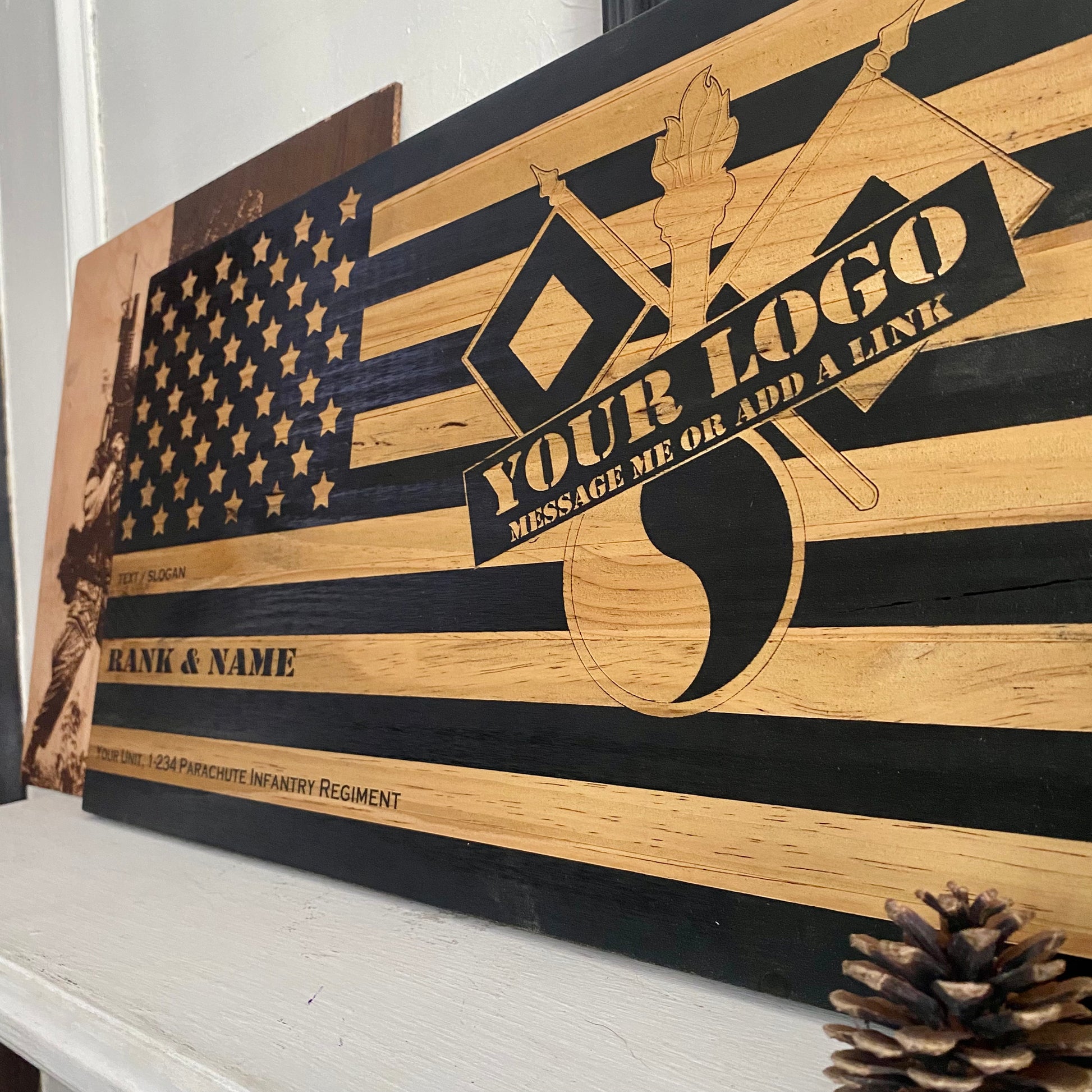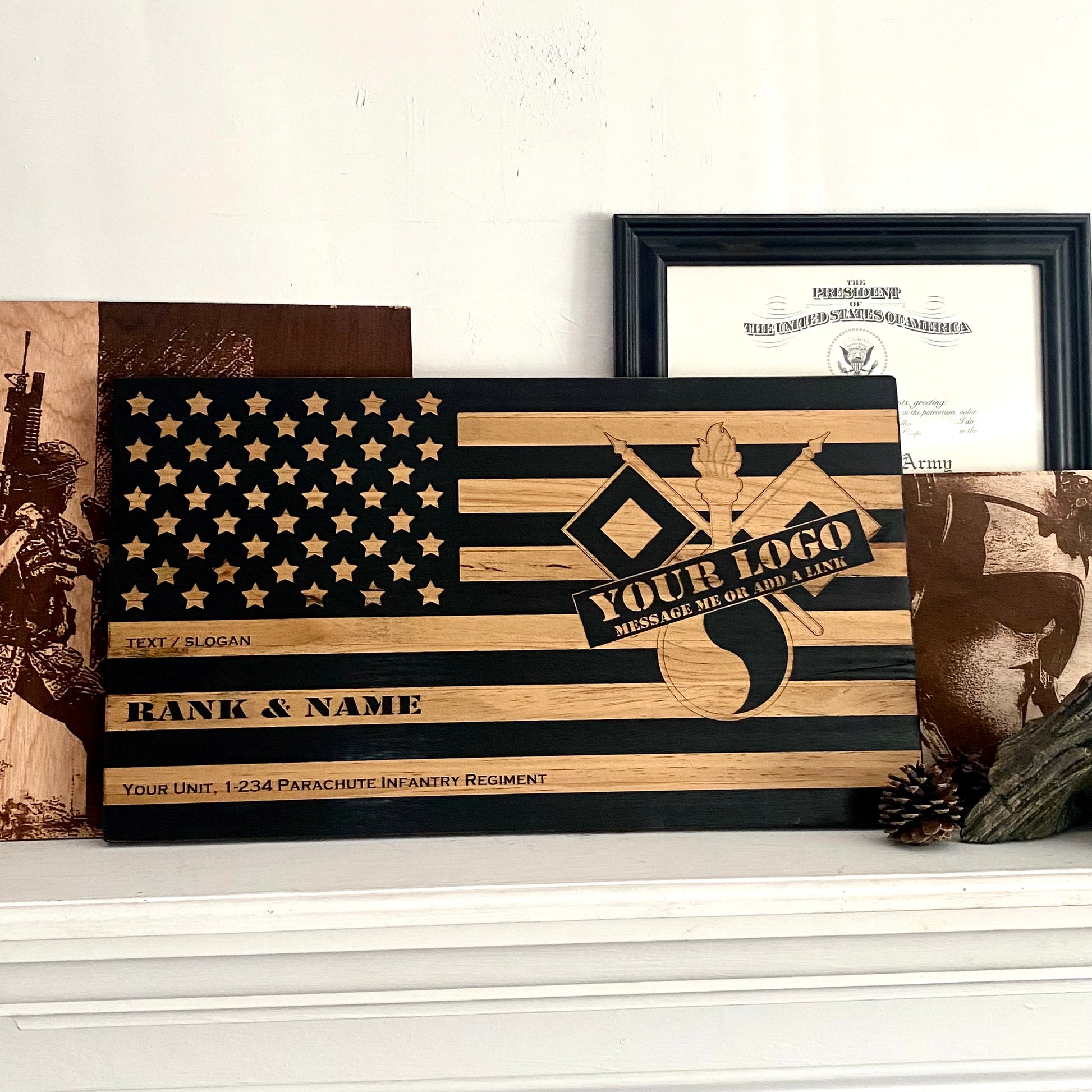 Looking for a unique Military gift or just want to have a memory of the unit you served in? We make custom engraved plaques made from solid wood. This custom engraved flag plaque is perfect for PCS, ETS or retirement! Perfect for display in your home or office! All plaques are made from handpicked pine, solid wood, and finished with 3 coats of Polyurethane. I've made tons these for organizations all over the U.S. and they're always a hit.