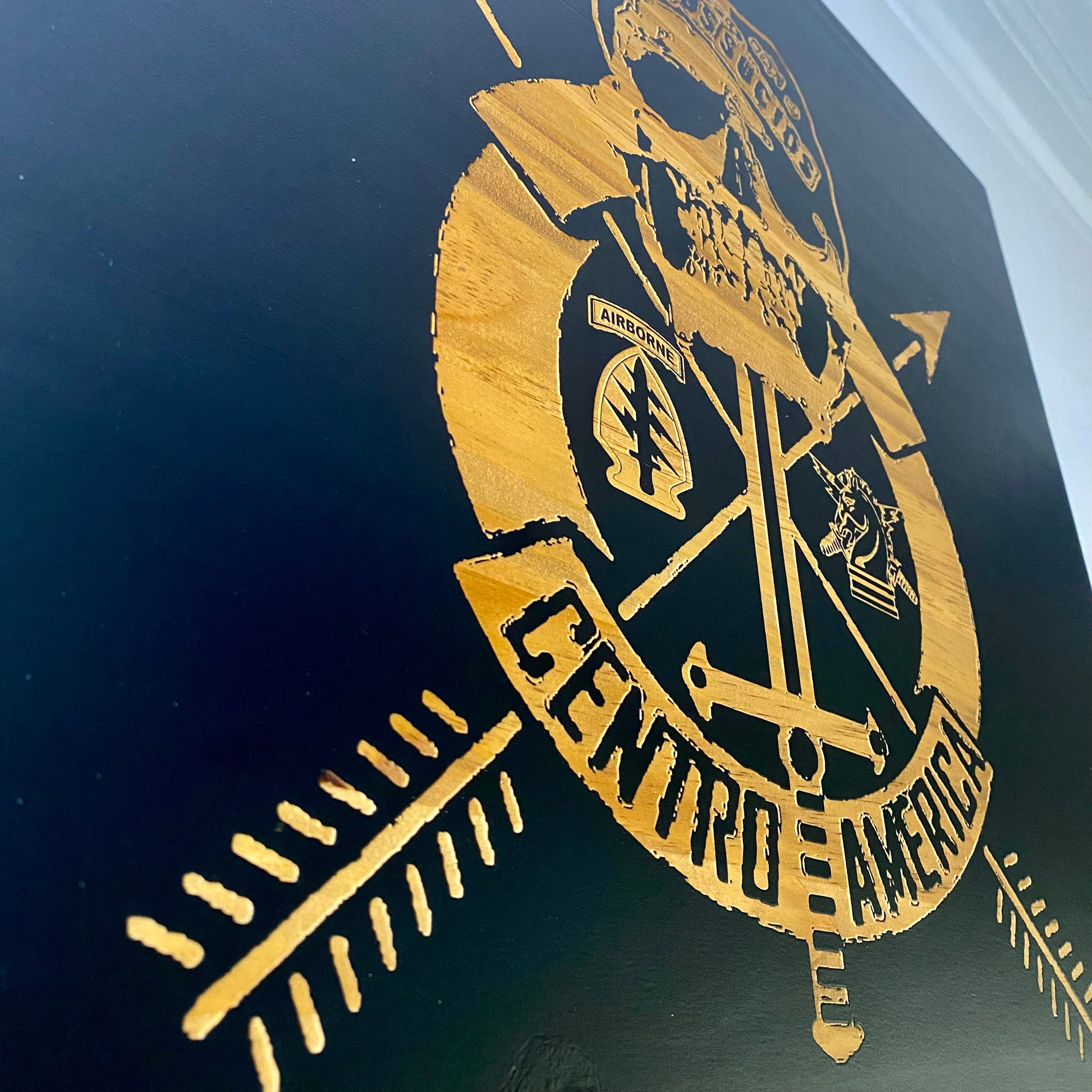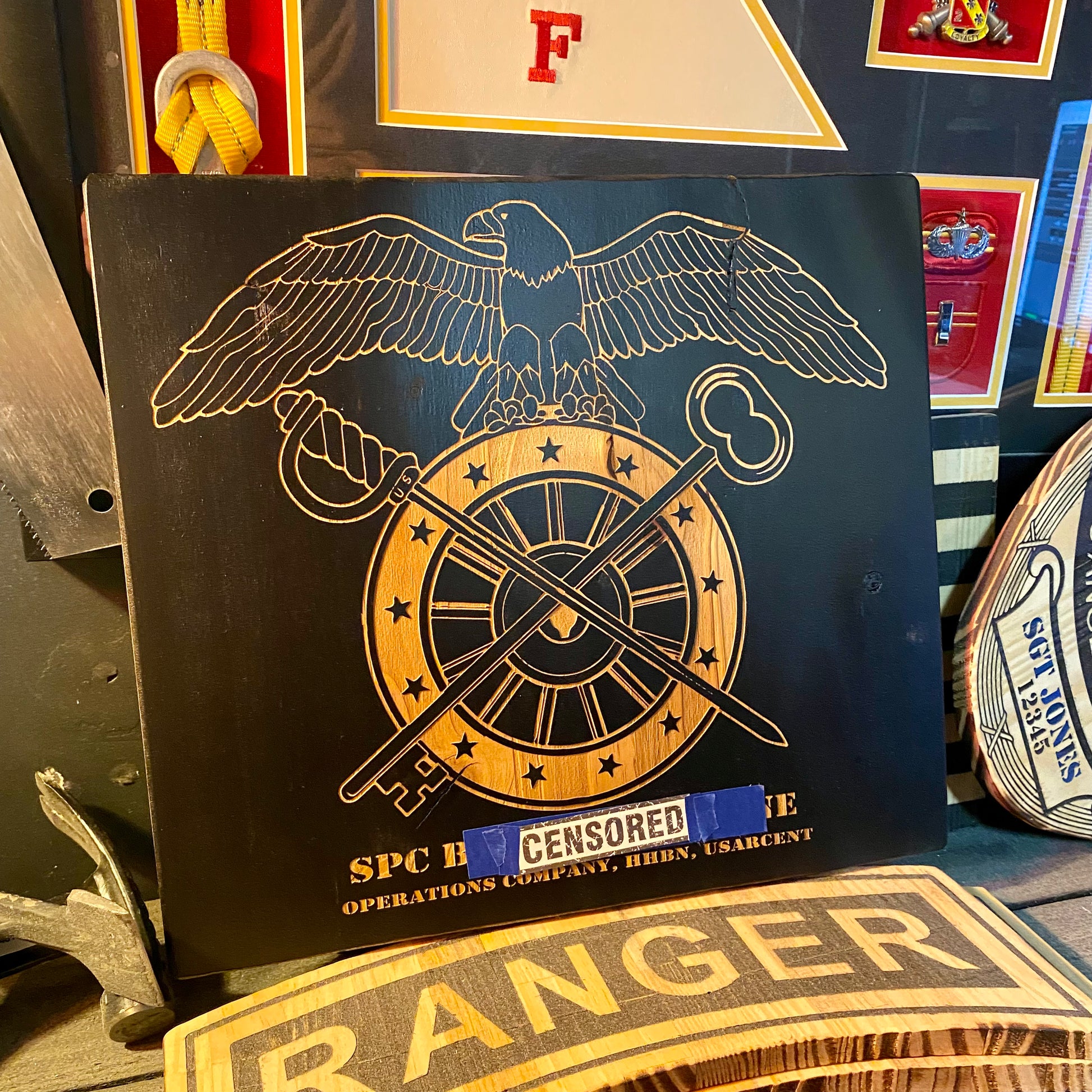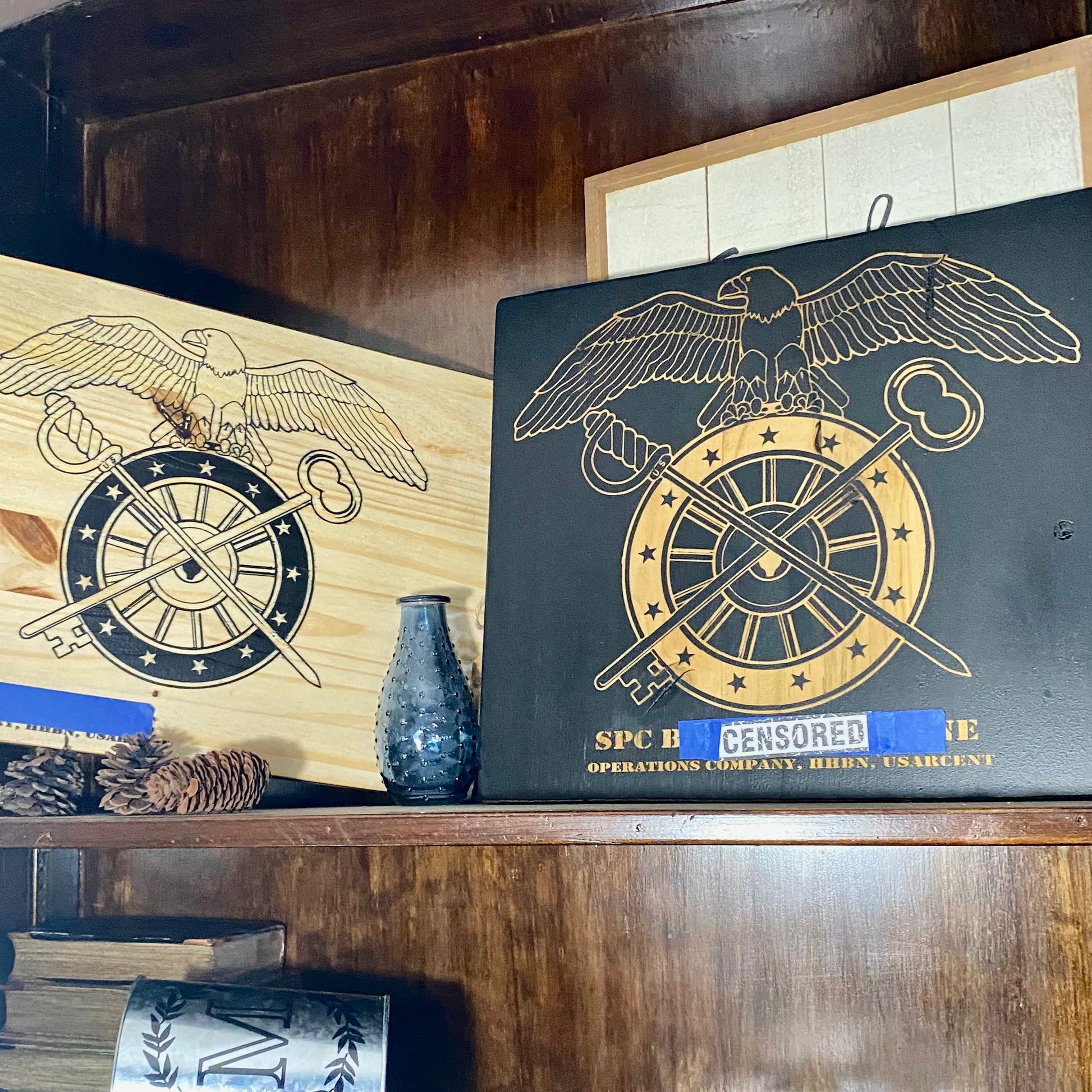 We make custom engraved plaques out of solid wood! Perfect for PCS, ETS, or Retirement gifts. Perfect for display in your home, Man Cave, Dorm, or office! This Plaque is painted black then engraved with your organizations logo. Made from hand-picked, solid pine and finished with x3 coats of clear finish.